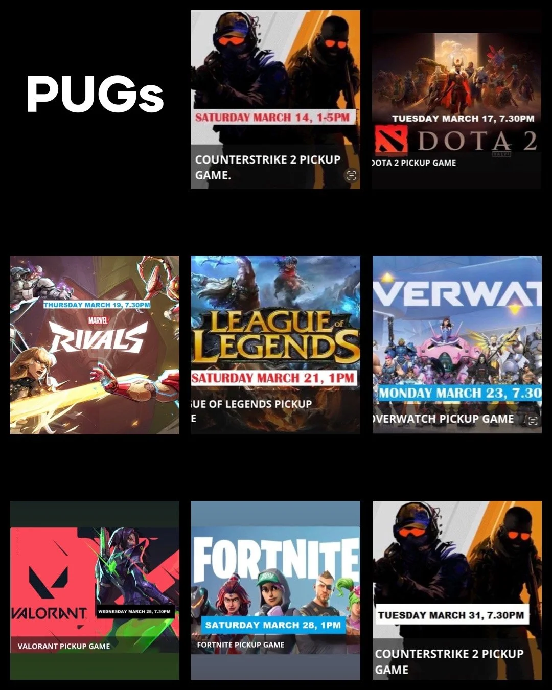 TEAM PARTIES WALK-INS ESPORTS STUDY BREAKS BIRTHDAYS DATE NIGHTS COFFEE BREAK GROUP EVENTS SINGLE-PLAYER BIRTHDAYS TOURNAMENTS PICK-UP GAMES