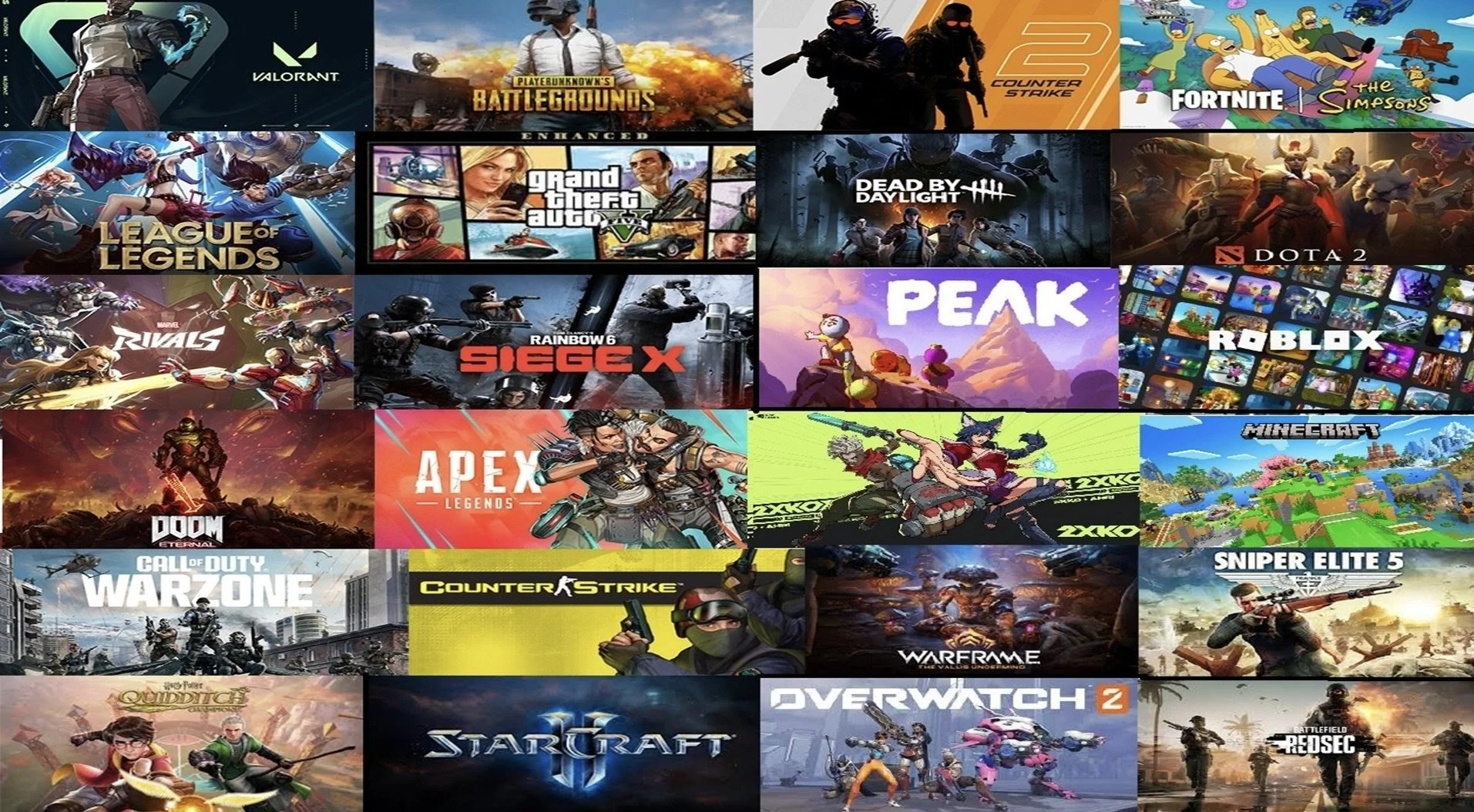·Apex Legends · Arc Raiders · Battlefield 6 REDSEC · Bongo Cat · Brawlhalla · Call of Duty Warzone · Chivalry 2 · Civilization 6 · Counterstrike · Counterstrike 2 · Counterstrike Source · Crossfire · Cry of Fear · Dead by Daylight · Delta Force · Destiny 2 · Doom Eternal · Dota 2 · Elder Scrolls Online · Fall Guys · Fallout 4 · Fishing Planet · Five M · Fortnite · Fragpunk · Genshin Impact · Grand Theft Auto V · Halo Infinite · Harry Potter Quidditch · Hogwarts Legacy · Hollow Knight Silksong · League of Legends · Left 4 Dead 2 · Lego Lord of the Rings · Marvel Rivals · Minecraft · Old School Runescape · Overwatch 2 · Predator: Hunting Grounds · Palia · Peak · PUBG · Puck · Rainbow Six Siege · Roblox · Rocket League · Runescape · Skate · Sniper Elite V · South Park The Fractured But Whole · Splitgate 2 · Stumble Guys · Team Fortress 2 · The Finals · The Walking Dead · Trackmania · Total War: Warhammer III · Valorant · Warframe · War Thunder · Wuthering Waves·